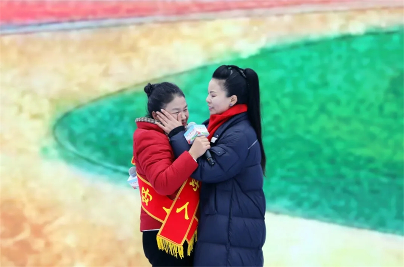 中国好人李遇梅(左)与社区工作人员(右)深情互动。王楠 摄