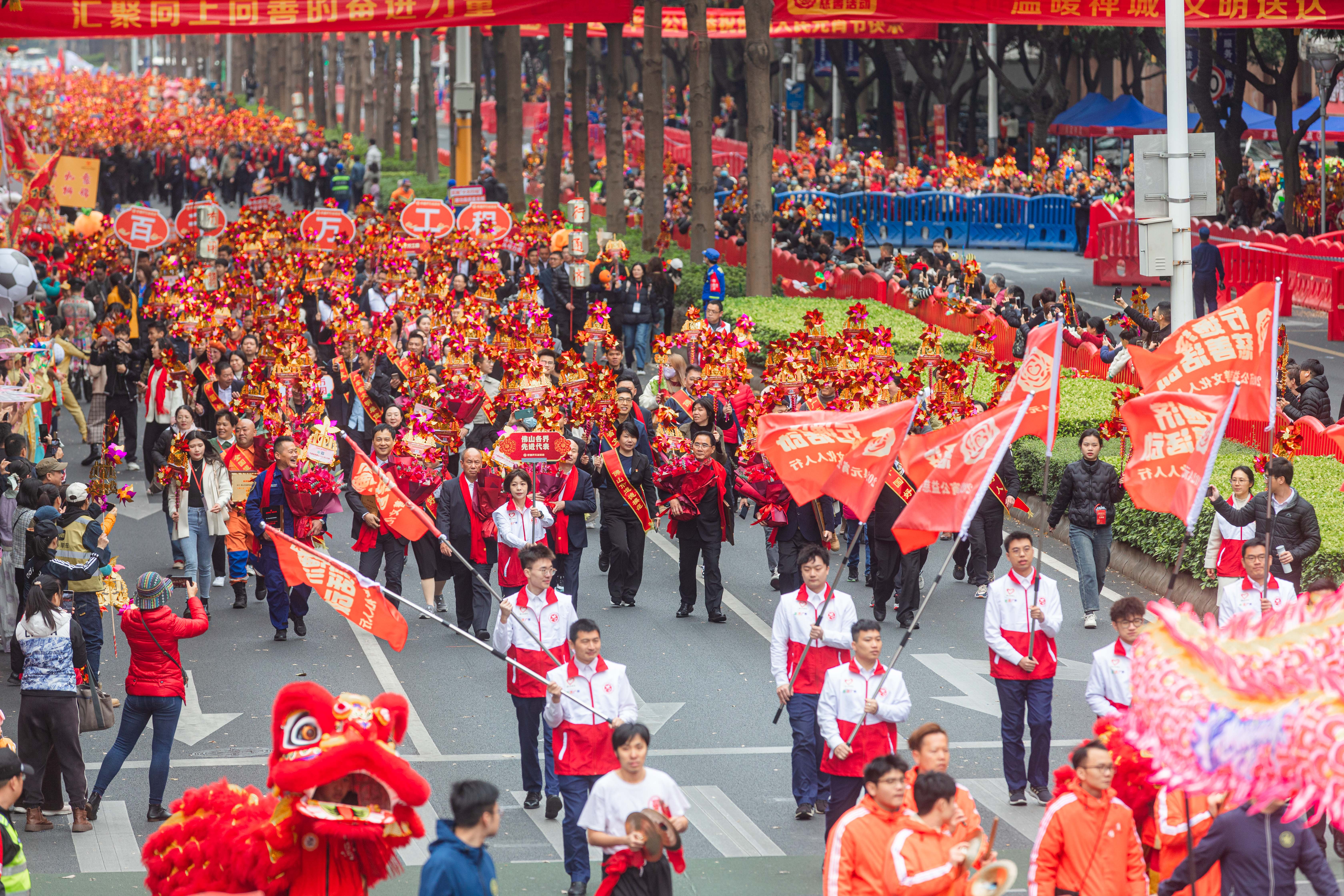佛山是国家历史文化名城,龙狮、龙舟、功夫、粤剧、陶艺等传统文化丰富多样,传统文化与现代文明交织。巡游出发后,舞龙、醒狮共同登场,瞬间点燃现场氛围。沿途中,粤剧演员和青年歌手演出粤剧唱词和说唱歌曲,让大家沉浸式感受佛山文化魅力。(供稿:广东省文明办 佛山市文明办)