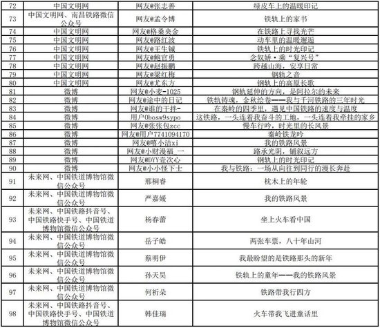 打印:12月30日,由中宣部文明创建局、中央网信办网络传播局、中国作协创联部、中国国家铁路集团有限公司党组宣传部联合举办的“我的铁路风景”故事汇原创美文征集展示活动优秀作品名单公布,共252件。