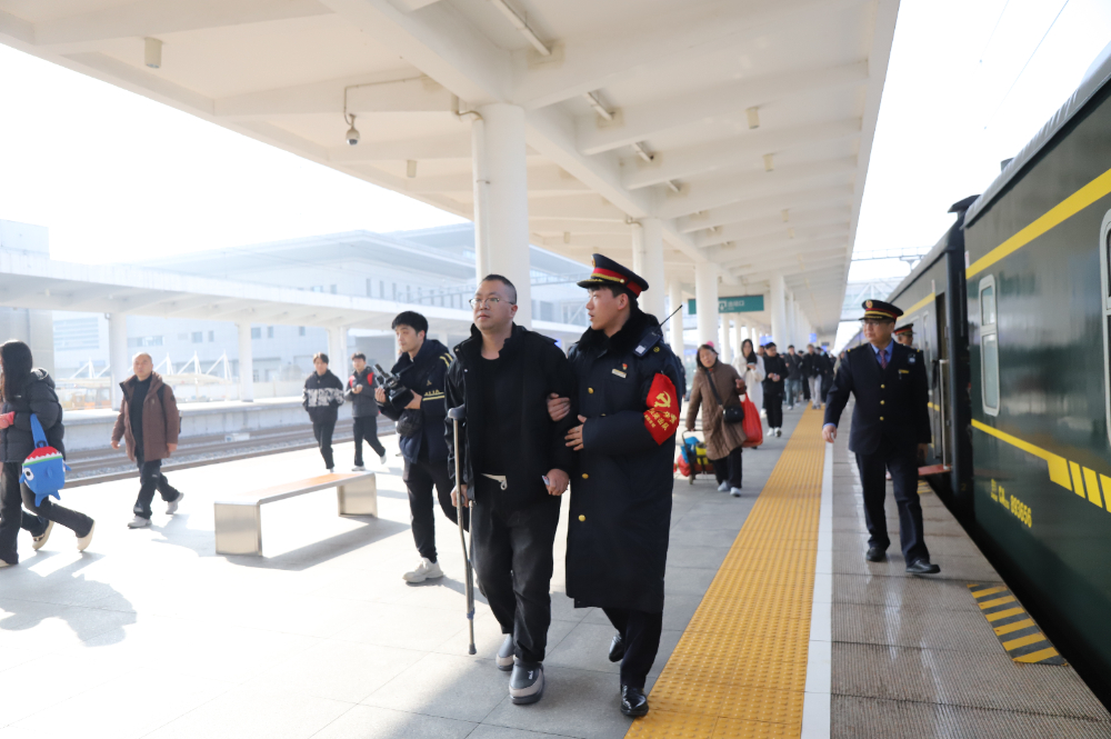 在南阳火车站内,客运员搀扶受伤旅客。中国文明网网友@李金玺 摄