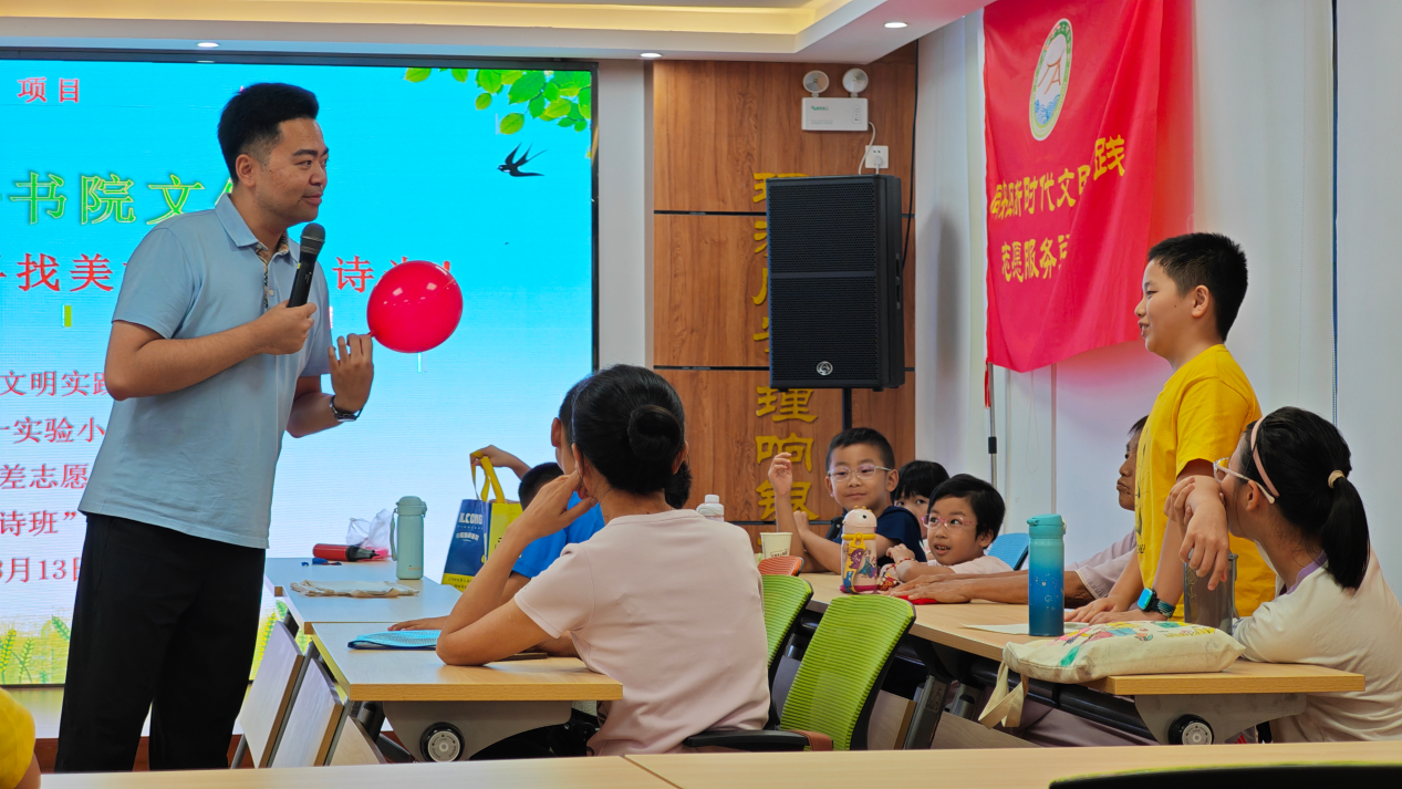 同安区举办的“文明实践+书院文化 遇见儿童诗”文明实践活动上,一名老师在与孩子们互动。新华网 刘默涵 摄